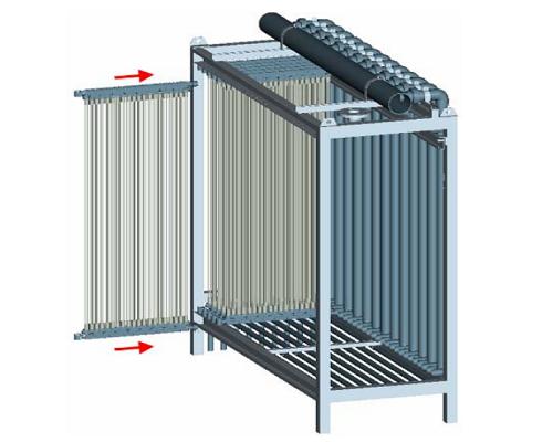 3.浸沒式的膜組件,所有膜組件要徹底浸沒在水中,膜池深度到在1.5米以上